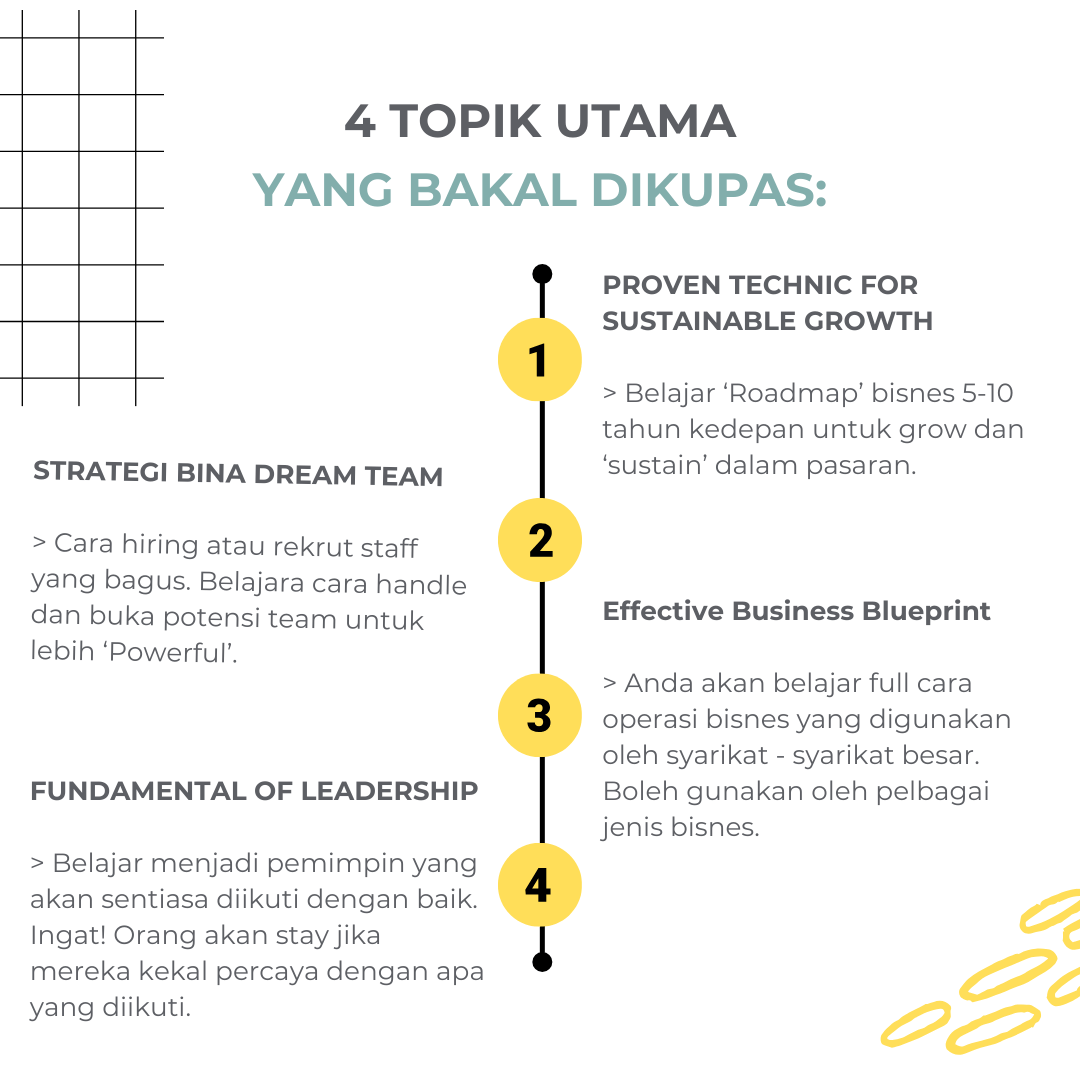 > Ada 4 topik utama merangkumi pelbagai aspek bisnes. Dari strategi marketing & sales sehinggalah cara bina team yang padu dalam bisnes. Sesi soal jawab juga akan dibuka pada hujung sesi.